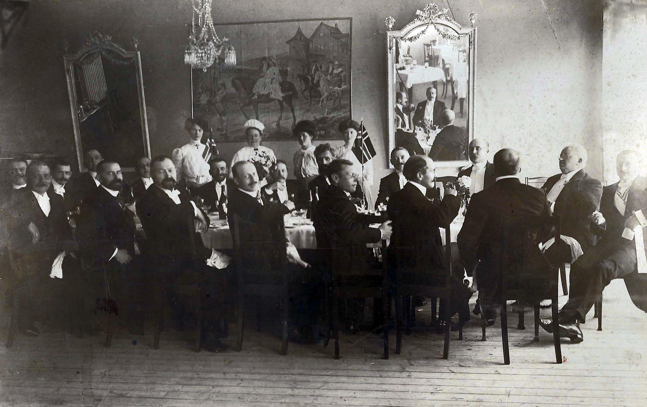 Vi er på det gamle Grand hotell i Narvik en gang tidlig på 1900-tallet. På hotellet hadde de en «speilsal», og på ett av de to speilene i denne salen, kan vi se videre innover i salen. Bildet forteller ikke hvem herrene er, og hva det er de feirer, men de har vært så elskverdige at de har latt serveringspersonalet få være med på bildet. Den unge damen til høyre er også navnløs, men hun ble senere gift med Birger Hammarstrøm, som var sporskifter og konduktør og bodde alle sine dager i Taraldsvik. Birger var sønn av den svenske ralleren Johan Hammarstrøm fra Værmland.