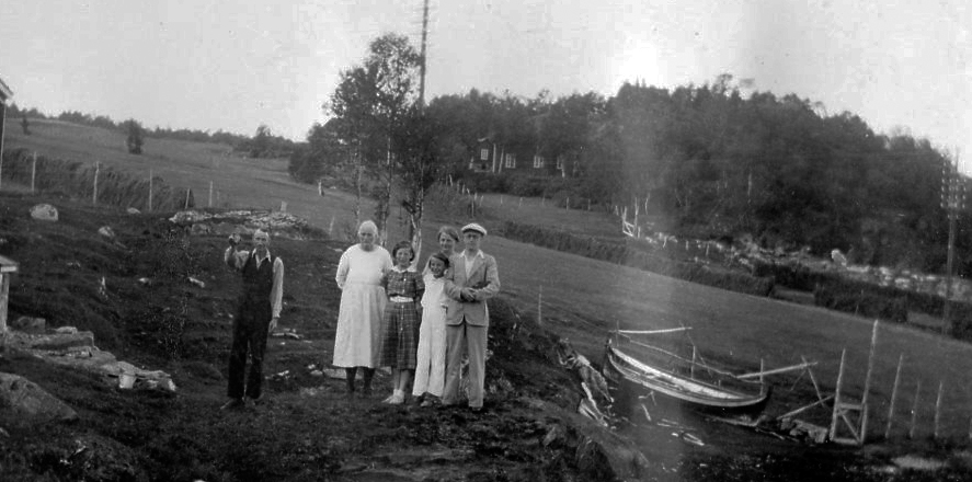 Dette er Øyjord på 30-tallet. På bildet står Henriette Wiker ved hytta til sin datter Johanna. I bakgrunnen ligger gården som hun og mannen Erik Wiker skapte. Det er litt ut på sommeren. Høyet er kommet på hesjer og markene ligger slette, grønne og nyklipte. Det er bygget vei frem til huset deres.